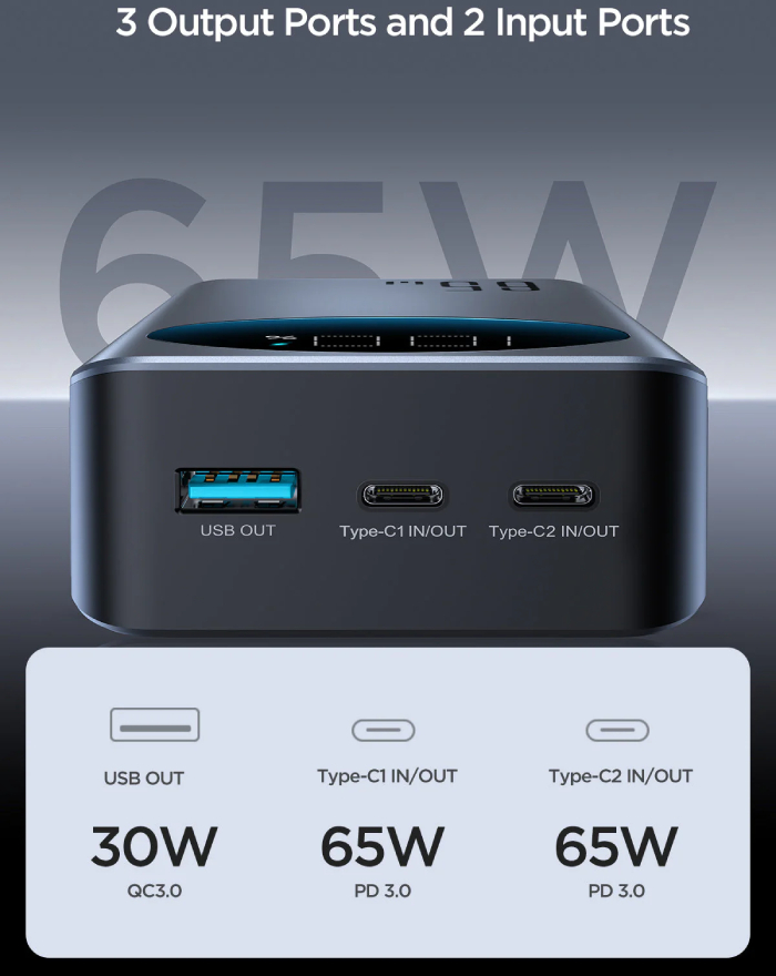 پاوربانک 30000 جویروم مدل JR-PBF05، دو عدد پورت دوطرفه Type-C با حداکثر توان خروجی 65 وات و یک عدد پورت USB-A با حداکثر توان خروجی 30 وات تعبیه شده است که شما میتوانید همزمان 3 دستگاه را شارژ کنید.