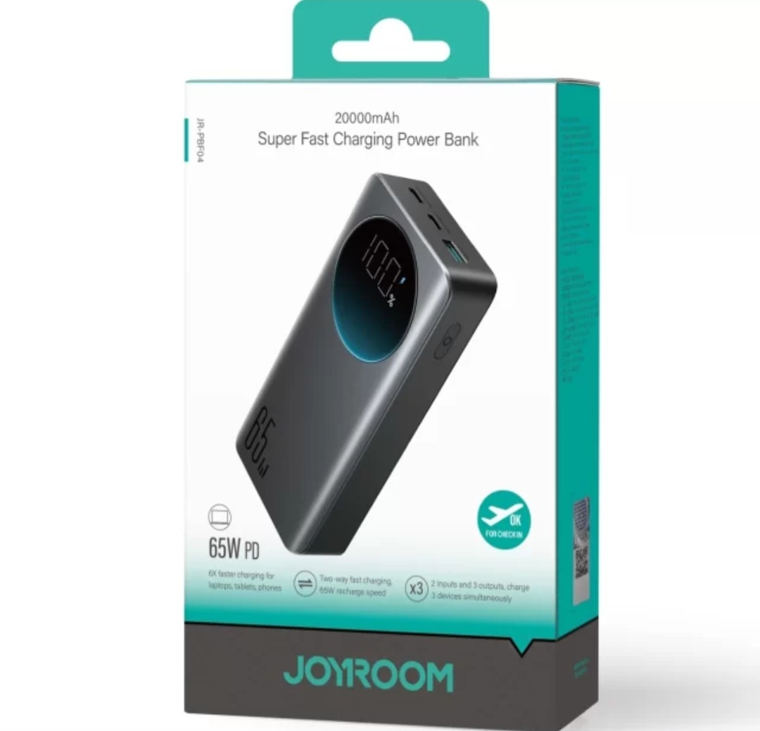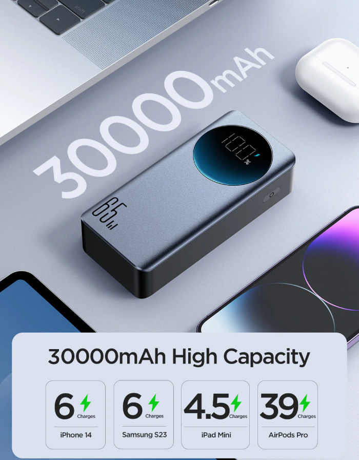 پاوربانک فست شارژ کمپانی جویروم مدل JR-PBF05 با پشتیبانی از شارژ سریع PD 65W با پورت Type-C به شما این امکان را میدهد تا تنها در عرض 30 دقیقه، بتوانید مک پرو 16 اینچی را تا %30 شارژ نمایید.