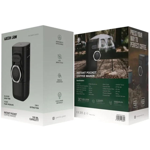 ست قهوه‌ساز جیبی فوری گرین‌لاین مدل GNINPCOF100BK یک قهوه‌ساز دستی و جمع‌وجور است که با ظرفیت مخزن و فنجان 100 میلی‌لیتر، برای تهیه یک شات اسپرسوی سریع با فشار 15 بار طراحی شده است. جنس بدنه از PA66 و آلومینیوم و قطعات غذایی به‌داشتی ساخته شده، مقاوم و مناسب استفاده در سفر است.