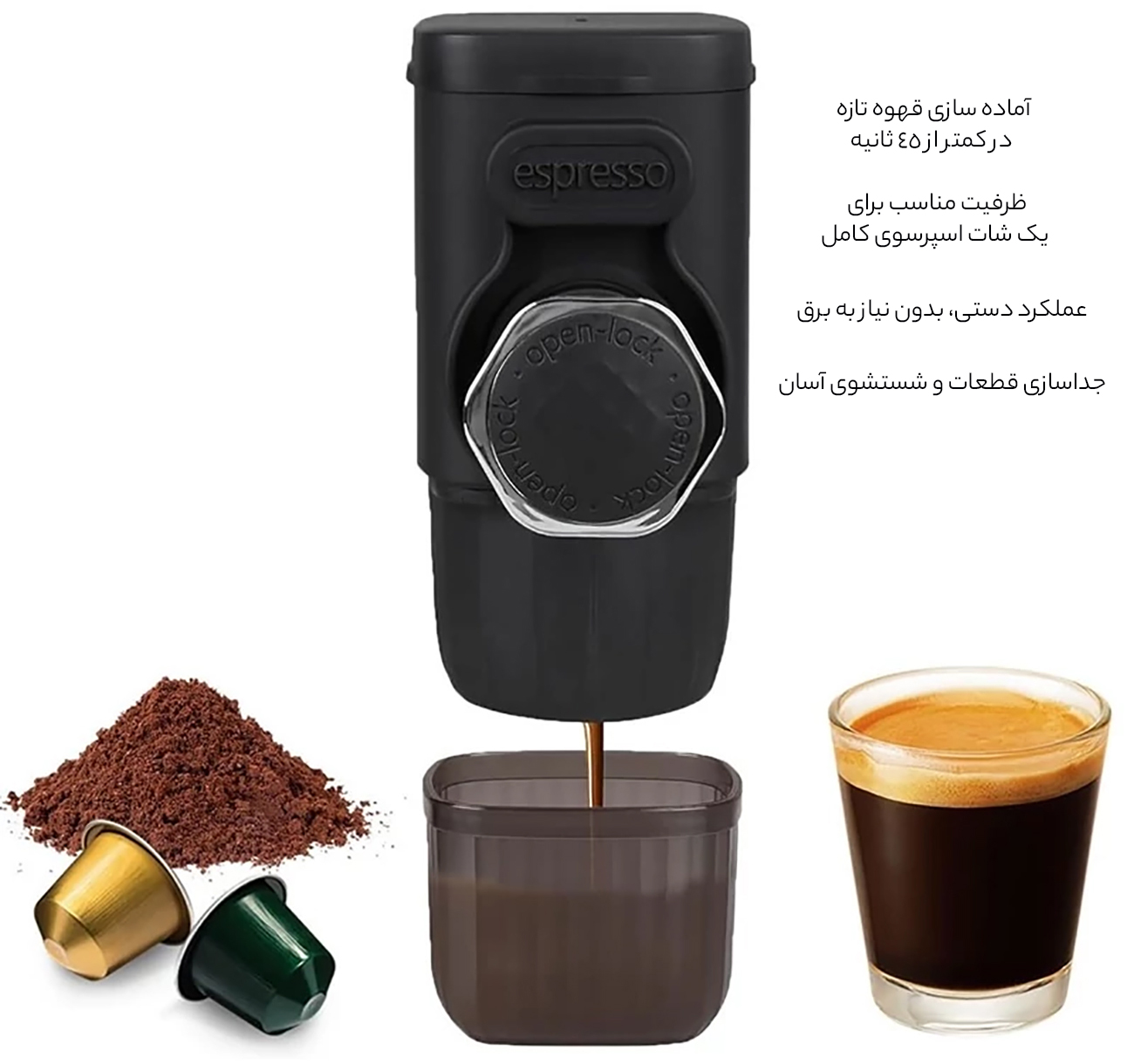 این دستگاه در 30 تا 45 ثانیه قهوه‌ای غنی و خوش‌طعم آماده می‌کند، دارای قطعات قابل شستشو و جداسازی، و عمر مفید تا 100000 بار استفاده دارد. همچنین قابلیت استفاده از پودر یا کپسول قهوه را دارد و با وزن کم (~280 گرم) و ابعاد کوچک، آن را به ابزاری ایده‌آل برای علاقه‌مندان به قهوه در سفر، محل کار یا طبیعت‌گردی تبدیل کرده است .